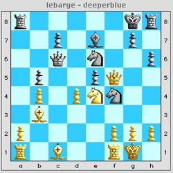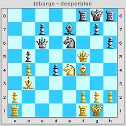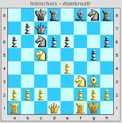 10. Bxf7+ (?? il fallait en profiter par Nxg7 !! fourchette et prendre la tour) Kf8 11. b4 (? perte de temps.Mieux vaut éviter de jouer trop de pions) Bg4 12. Qg3 h6 (? trop tot : préparer d'abord l'attaque du cavalier avec dame en d6) 13. Ne6+ Bxe6 14. Bxe6 Qd6 (trop tard) 15. Bc4 (les noirs ont une avance de développement et les blancs devraient réagir) a6 16. Qg6 (Pour viser encore f7 et le mat. Les blancs exploitent la faiblesse des noirs sur les cases blanches) Nd8 (seul coup) 17. O-O b5 18. Bb3 Ne6 19. Nd2 (avantage des blancs avec la paire de fous. f7 reste fragile, il faut l'exploiter) Nd5 (vise f4 ?) 20. Ne4 (! indélogeable et menace la dame et le cavalier) Qc6 21. c4 Ndf4 22. Qf5+ Kg8 (Attention, le cavalier en e6 va être en danger) 23. cxb5 (eh hop, le cavalier en e6 est bloqué par le fou b3!) axb5 24. d4 (!? vous avez vu le piège ?)