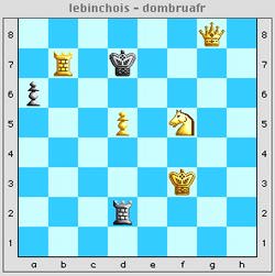29...Bd4+ (?? Le tournant de la partie : un bien mauvais sacrifice du fou, poussant à l'échange des dames...et les noirs se retrouvent avec une pièce et des pions de moins, avec en face une paire de cavalier meurtrière ! Dame en e6 par exemple était bien plus intéressant car menaçait h2 et prenait d6) 30. cxd4 Qxf3 31. Nxf3 Rxe4 32. Re1 Reg4 33. Re2 Kc8 34. d5 Kd7 35. Nfe5+ (on rend la fourchette !) Kxd6 36. Nxg4 Rxg4 37. Ne5 Rd4 38. h4 (? trop rapide) Rxh4 39. Ng6 (menace la tour noire et vise e7) Rd4 40. Ne7 (protège le pion) b5 41. Re6+ Kd7 42. Re5 Rd2 43. Nf5 Rxb2 (les noirs récupèrent des pions) 44. Re7+ Kd8 45. a3 Ra2 46. g4 (! un pion qui va faire très mal...) Rxa3 47. Kf2 Rd3 48. Re5 b4 49. Ke2 Rh3 50. Re7 Ra3 51. g5 b3 52. g6 b2 53. g7 Rg3 (!!!) 54. Rb7 (! seul coup pour empêcher g8=dame et mat, mais ce n'est qu'un sursis) Rg2+ 55. Kf3 b1=Q 56. Rxb1 Rd2 57. g8=Q+ Kd7