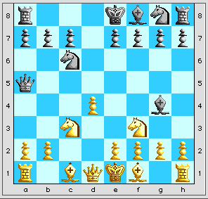1. d4 d5 2. Nf3 Nc6 (Tchigorine) 3. c4 Bg4 4.cxd5 Qxd5 (au lieu de Fxf3) 5. Nc3 Qa5 6. d5 (Quiz !! que faire ?)
